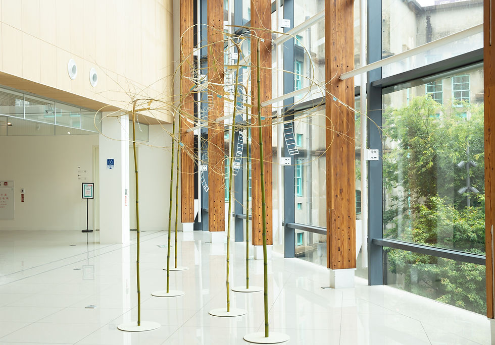 Breathing takes drawn lines as its core visual language, using Taiwanese makino bamboo and brass wires to form an irregular circular structure suspended in space. These lines resemble unfinished sketches or fragments of a musical score, intersecting and pulling across the air as they respond to the invisible rhythms and currents between the viewer and the work.